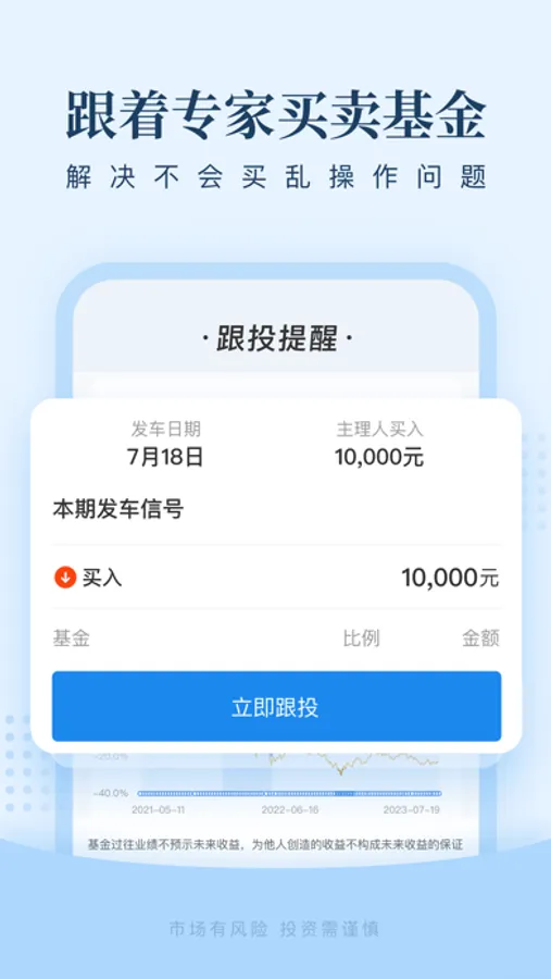 从业经验超过10年的专业投资机构及知名投资达人:盈米研究院、交银施罗德基金多元资产管理部、ETF拯救世界、简七、刘备教授、月风投资笔记…全程指导用户投资,跟投用户仅需根据主理人指令,一键跟投买入、卖出、调仓等,即可以便捷完成全部投资操作。
