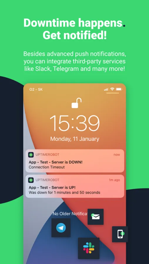 We check your service in 1 min* intervals and you get notified via push notification about every outage. Simple as that.