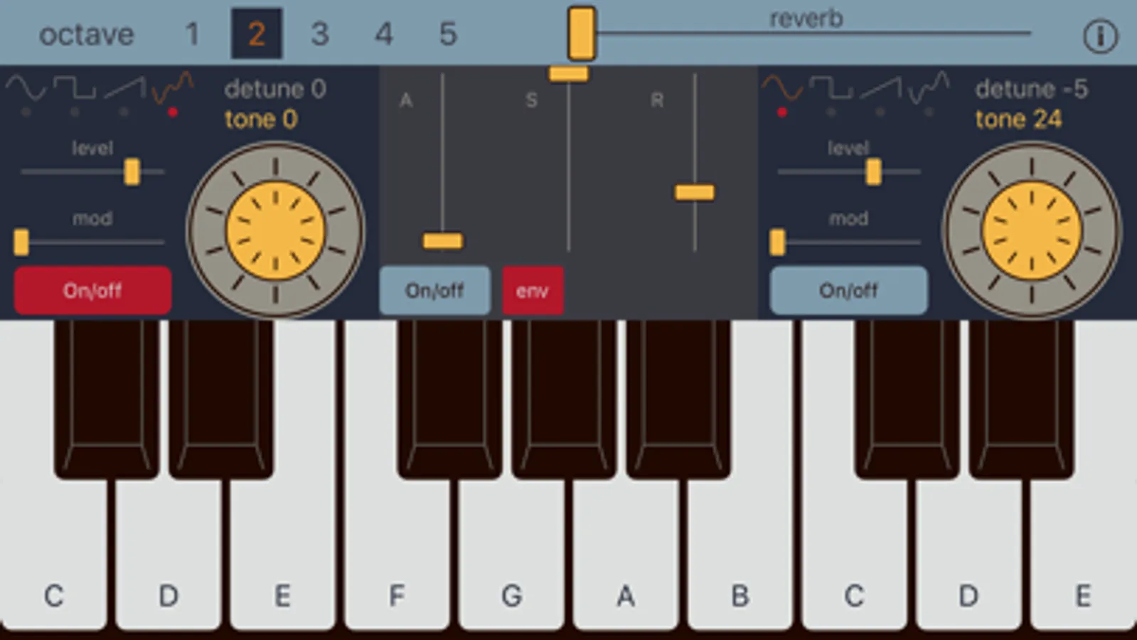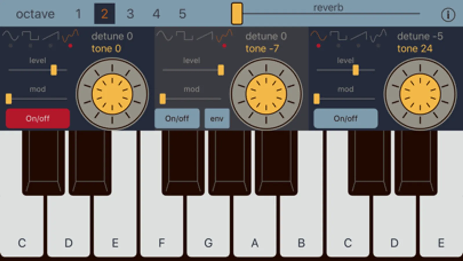 Sonic Synth main features: - 3 oscillators - 4 wave form types for every oscillator - volume, modulation, tone and detune for every oscillator - envelope filters (attack sustain release) - multitouch - fast and usable piano keyboard