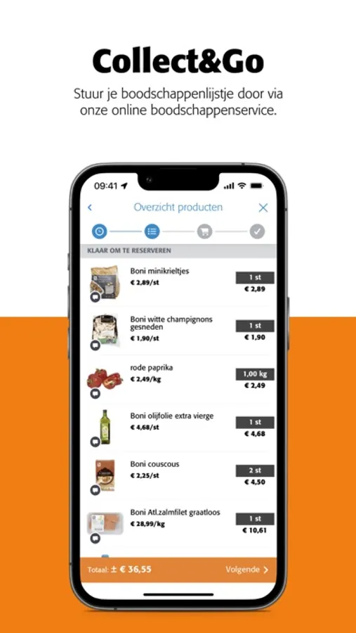 • Voeg producten toe vanuit de zoekfunctie, je favorietenlijstje, het assortiment ... Of gebruik je laatste kasticket of zelfs je favorietenlijstje bij Collect&Go als basis.