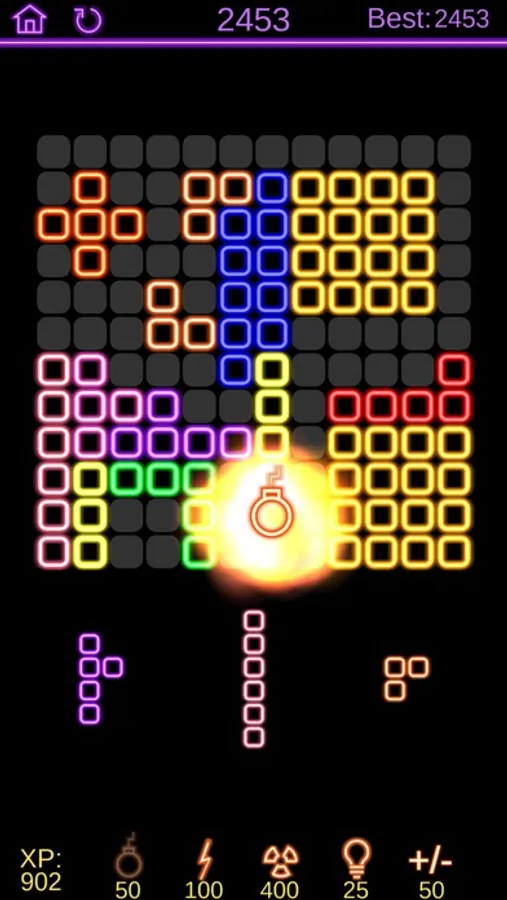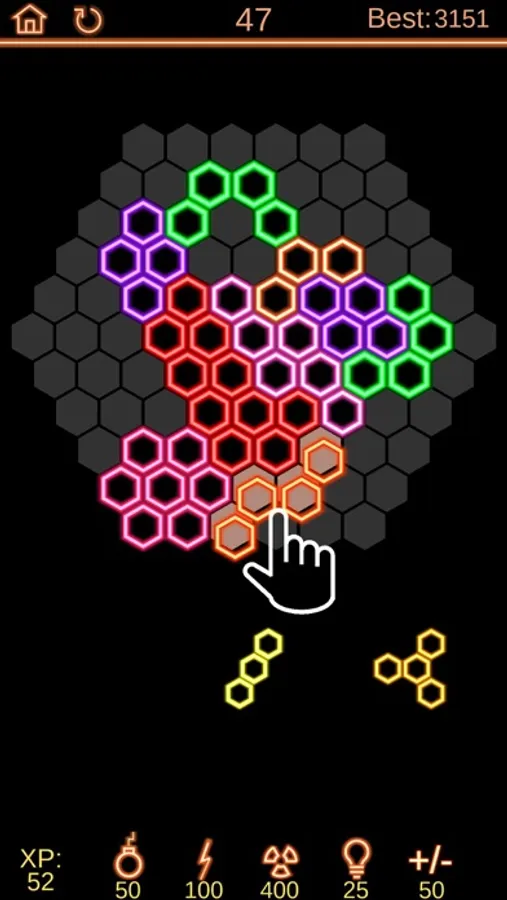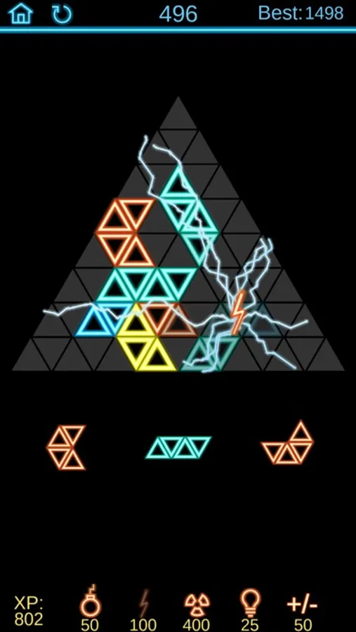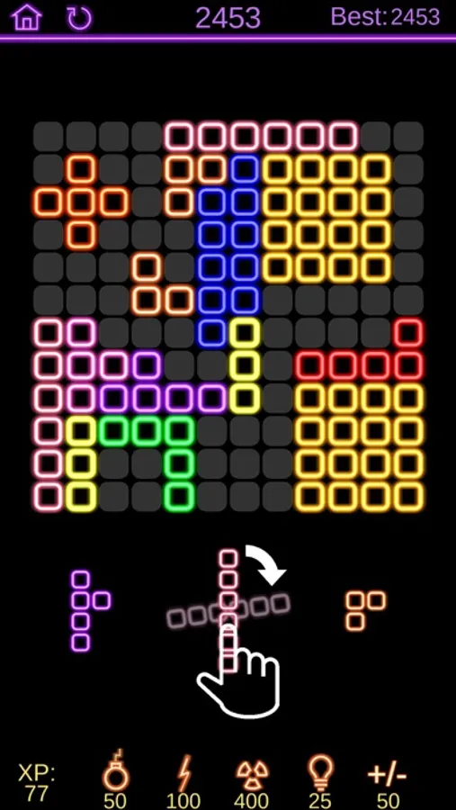 Create and then clear full lines of squares, hexagons, or triangles by rotating and then dragging and dropping pieces onto the board. Earn bonus points by clearing multiple lines in a single move. Earn XP for each line that is cleared and spend the XP on Power Ups to perform special moves!