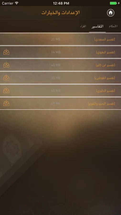 - يمكنك استعراض القرآن الكريم من خلال واصل التلاوة (التي تنقلك إلى آخر موضع قمت بإغلاق التطبيق وأنت تقوم بمطالعته) أو الفواصل (وهو الموضع الذي حددته أنت للوقوف عليه)