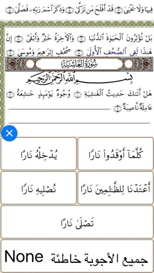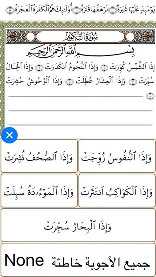 The application has more than three thousand tricky questions for each single juzu with options that are all derived from other similar ayat; and this in fact, stresses the miraculous eloquent style of the Qur'an Kareem wording.