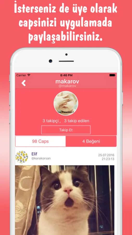 Capso uygulaması ile resim ve video capsler oluşturabilir, uygulama içinde paylaşabilirsiniz.