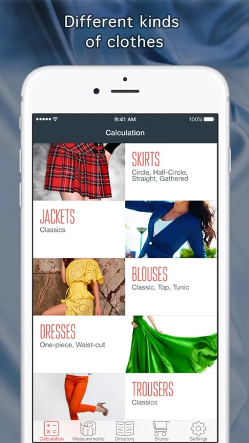 - You can calculate the amount of fabric needed for different kinds of clothes: dresses, blouses, skirts, trousers, jackets;