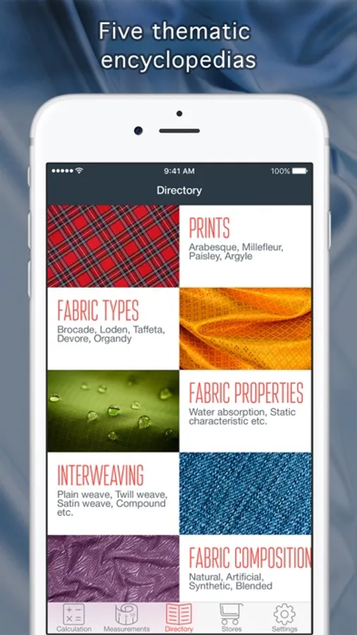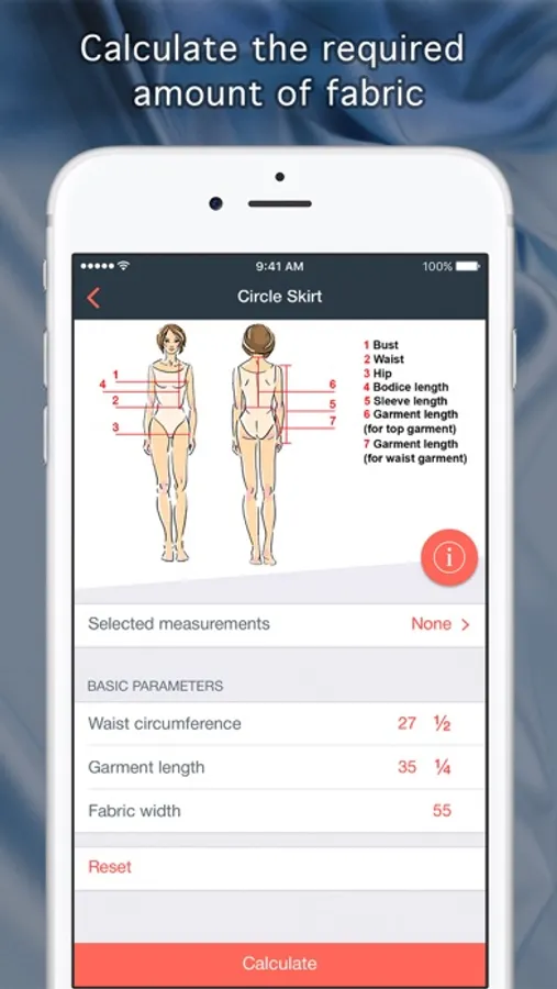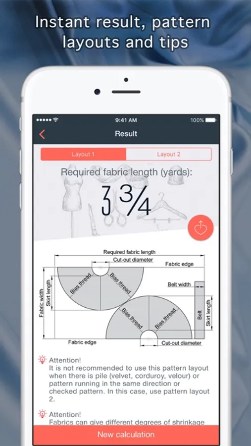 With this app, you can quickly calculate the right amount of material for any garment, find the nearest fabric store, as well as useful and interesting information about fabrics.