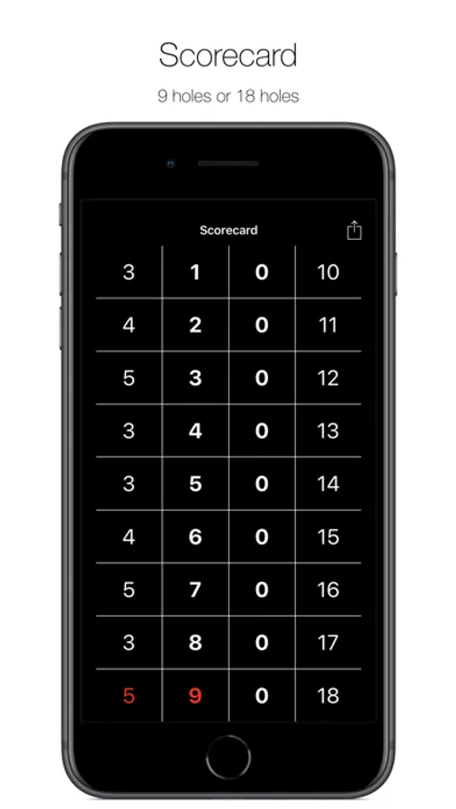 The screen shows eighteen square filled with zeros. A squares with numbers between one and eighteen are a labels and when tapped, selects the current hole. The current hole is highlighted with red color.