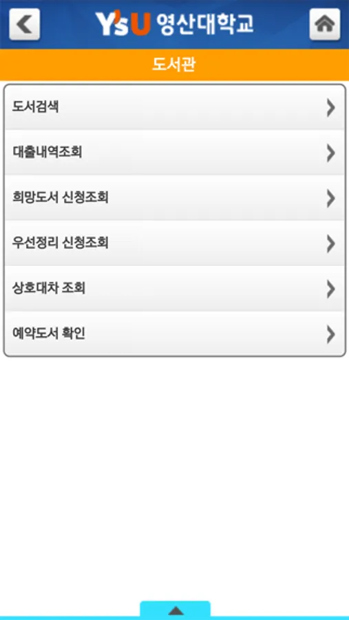 - 도서관 : 도서검색, 대출내역조회, 희망도서 신청조회, 예약도서 확인 등