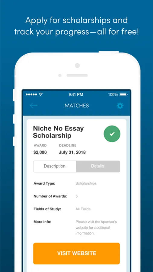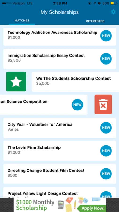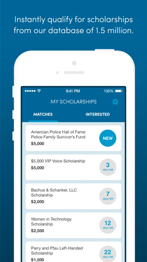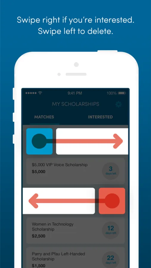 Use the Fastweb College Scholarships app to easily manage your scholarship list and decide which scholarships you’re interested in applying for via your mobile device. Simply swipe right to tag scholarships you’re interested in or swipe left to ignore scholarships you’re not interested in.