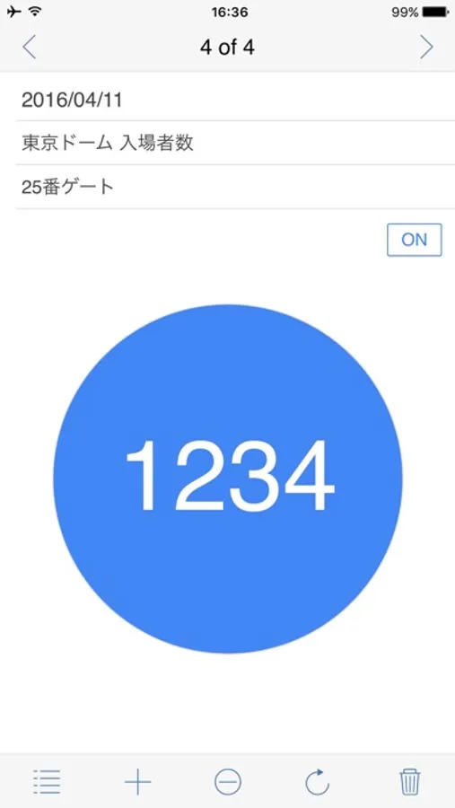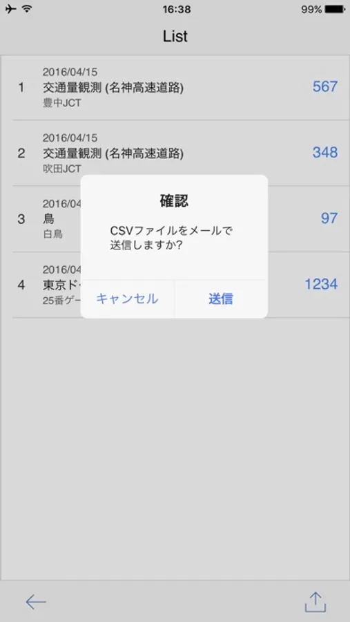 iPhone の画面上にあるボタンをタップして数をカウントします。イベント会場の人数や交通量の観測など様々な用途にご利用いただけます。カウントした日付・タイトル・メモ・カウント数は履歴として保存され、CSVファイルで出力することができます。