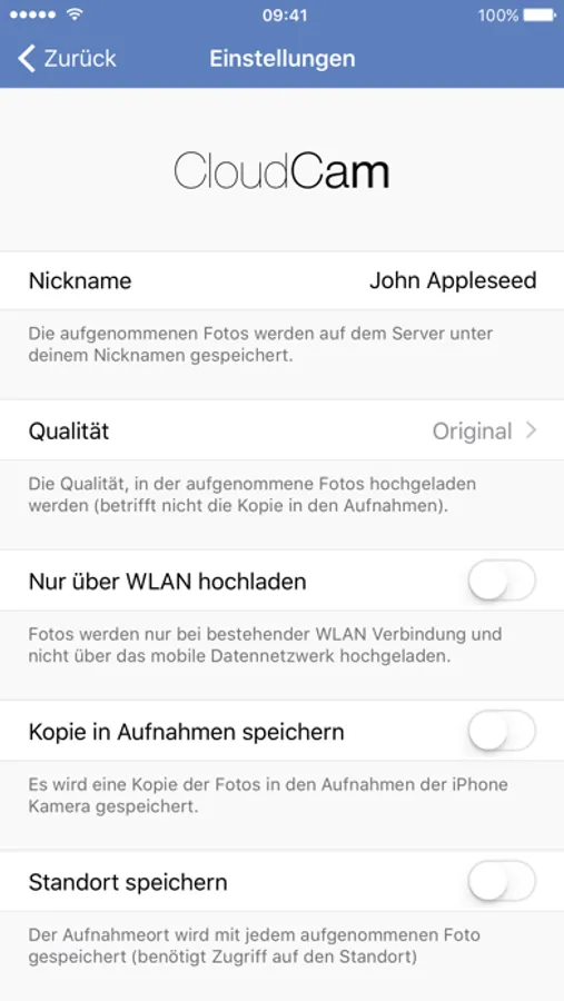 Die CloudCam-App speichert Fotos sofort nach Erstellung direkt in der Cloud. Diese App wurde für Unternehmen und Organisationen entwickelt, in denen Mitarbeitende mit ihrem Smartphone Fotos von unterwegs (z.B. Baustellen, Schadenfälle usw.) zu Dokumentationszwecken erstellen müssen. Dank CloudCam werden Fotos innert weniger Sekunden für die gesamte Organisation zugänglich, dies ohne manuelles und mühsames Synchronisieren. Folgende Einstellungen sind innerhalb der App möglich: