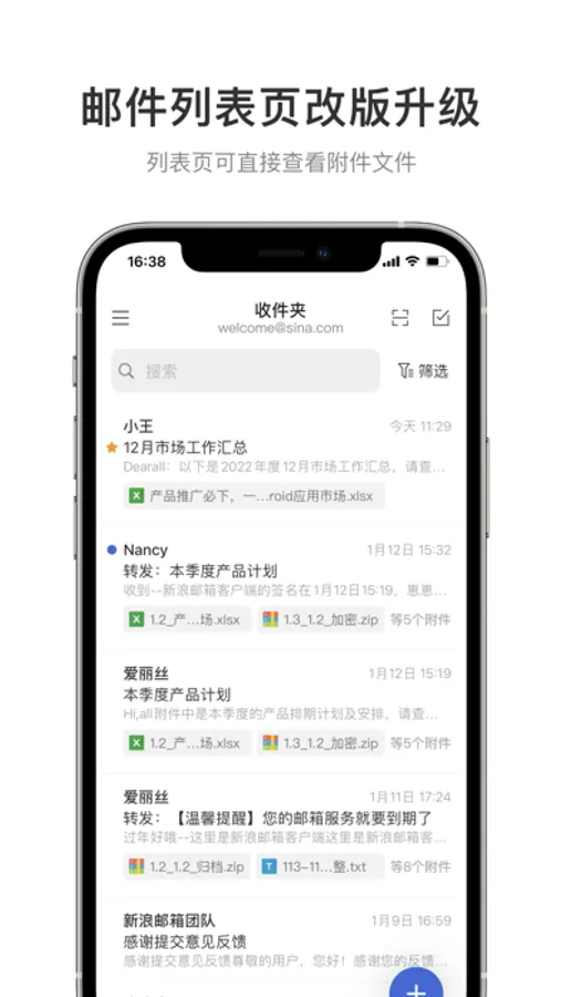 集中管理你的全部邮件,轻松标记已读或重要邮件;收件箱页展示丰富的邮件信息,帮你快速浏览和定位邮件;你还能一键收藏重要的附件,无需在海量邮件中查找。