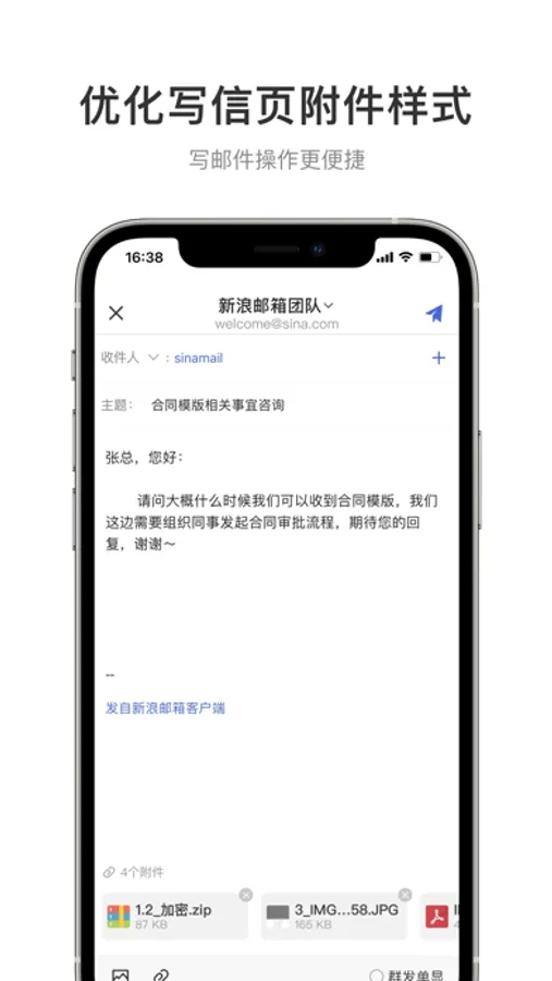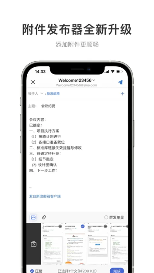 同步收取多个邮箱的所有邮件,下拉闪电刷新;收取多图邮件时可设置加载图片方式,发送多图片附件时自动压缩,为你节省流量。