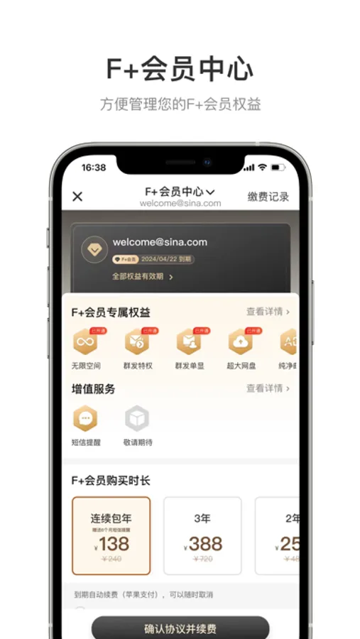 新浪邮箱专享F+特权,可在应用内通过以下方式购买: