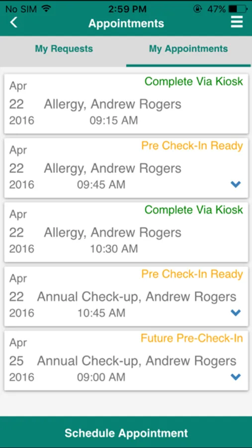 3. User can request for an appointment in the Appointments widget using schedule appointment option.If the appointment is confirmed from Hospital then user can complete pre check-in process.User can cancel the requested appointment if he/she wish to by using arrow down icon.
