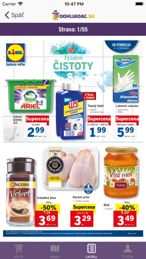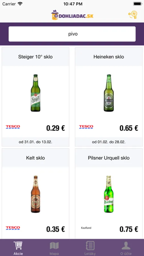 Obľúbená služba Dohliadac.sk už aj ako mobilná aplikácia! Prezerajte si akcie a letáky obchodov Tesco, Lidl, Kaufland, Billa a mnoho ďalších priamo vo svojom telefóne. V tejto aplikácii nájdete všetky aktuálne zľavy na potraviny, alkohol, drogériu či kozmetiku. Jednoducho si porovnajte akcie, vyberte tú najvýhodnejšiu cenu, vložte na nákupný zoznam a na mape nájdite najbližší obchod. Takisto si môžete prezerať akciové letáky spôsobom, ktorý šetrí životné prostredie.