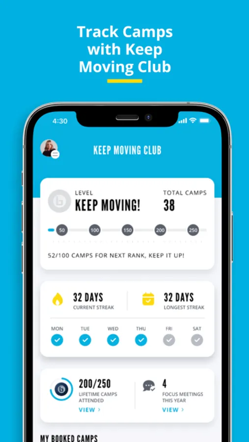 · Keep track of Camp streaks and lifetime Camps in our Keep Moving Club.