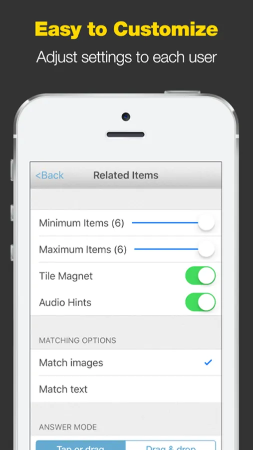• Customize items - every item is fully customizable (text, audio, and image). You can also add your own matching pairs
