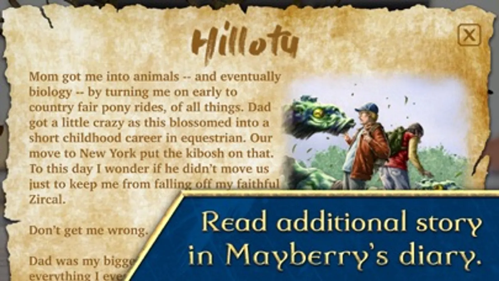 Many different Between Worlds characters pop out at you with interactivity, animation and sound! Touch the arrow in the lower right corner to read the diary entry on the creatures.
