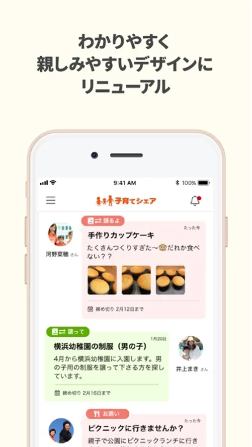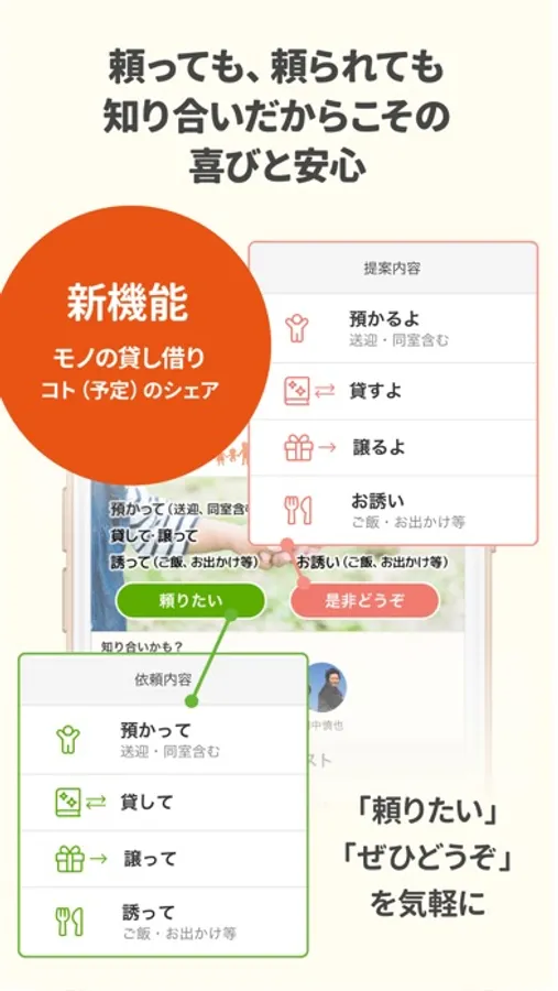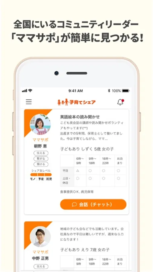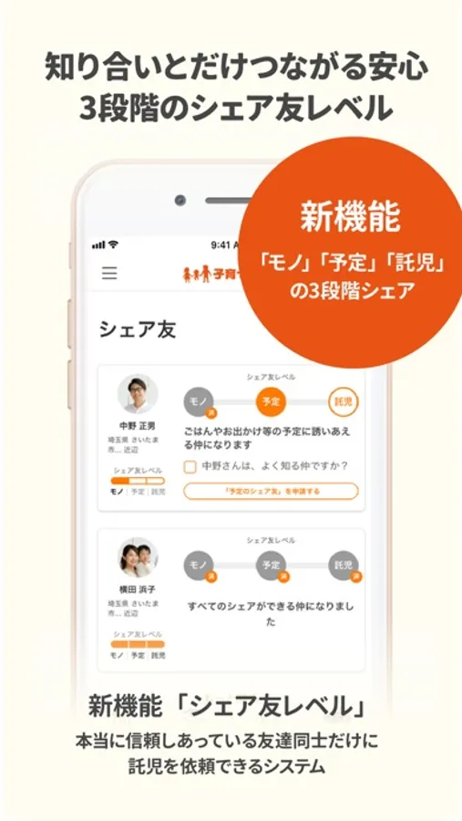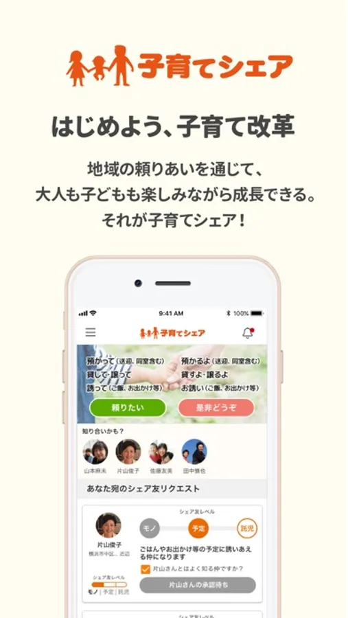 アプリ内で顔見知り同士でつながり、子どもの送迎や託児の頼り合いが出来ます。