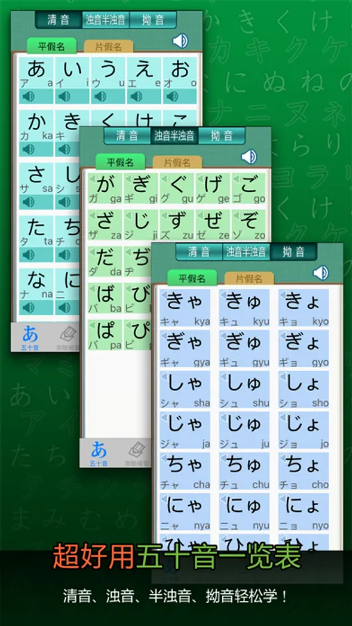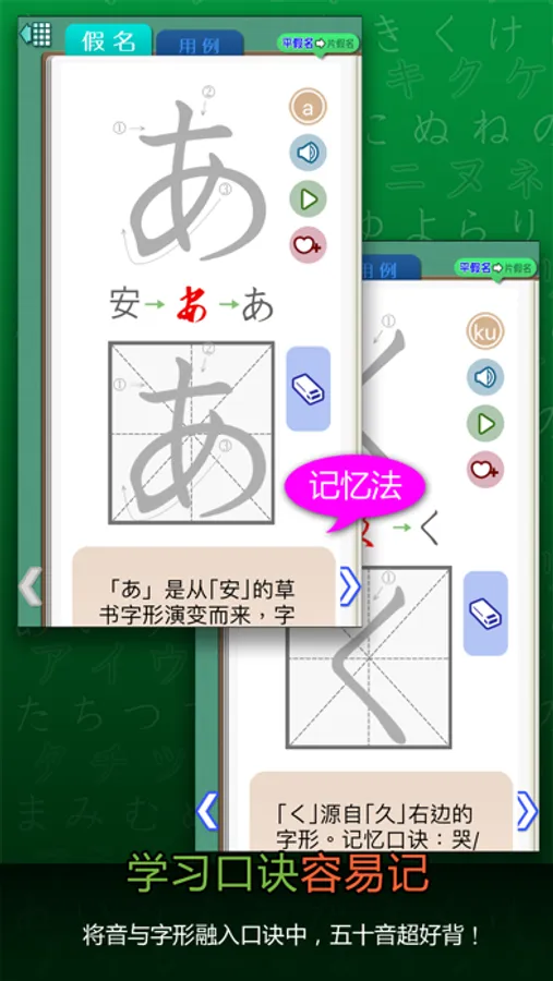 《五十音轻松学》利用记忆口诀,并强调利用字源、字形、字音联想的方式,同时搭配书写功能,让您不但记得快,还可达到过目不忘的效果。