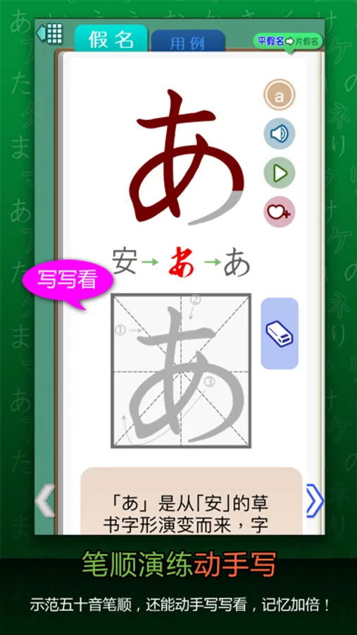*****利用字源、字形、字音的记忆口诀与联想,搭配书写功能,初学者也能轻松记住50音! *****