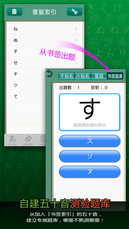 ●自建题库:利用书签功能自建专属的五十音测验题库,针对不熟的部份加强练习。