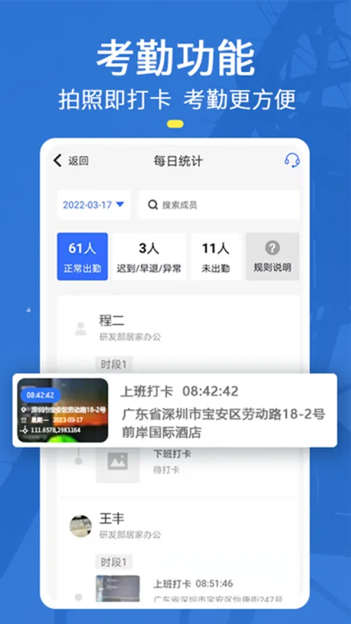 准确真实记录员工上下班时间、地点,当天出勤记录一目了然;