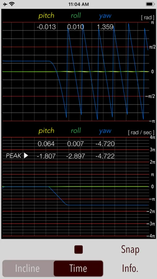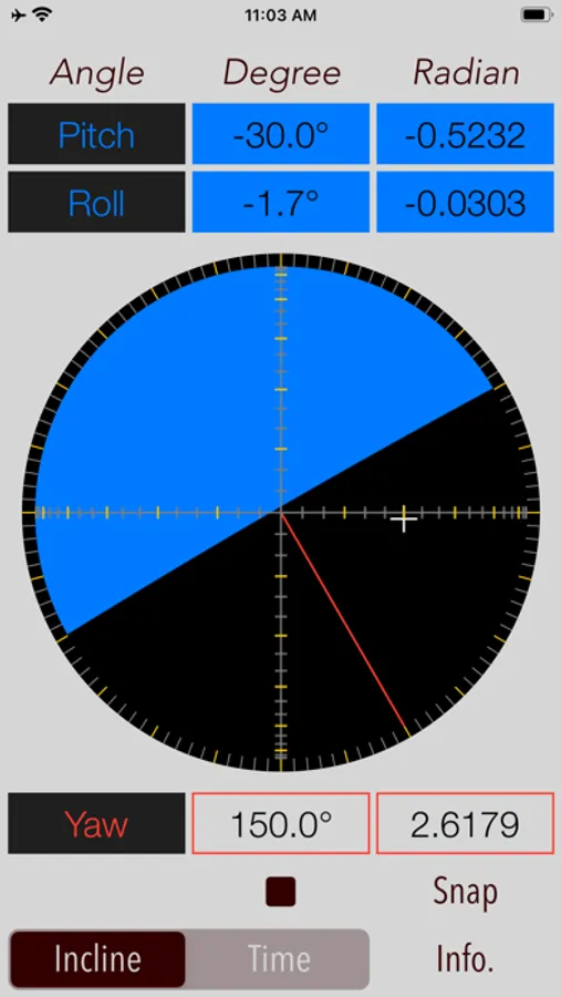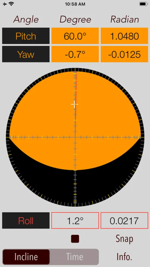 This mode utilizes the information of the acceleration sensor, and operates as a three-dimensional inclinometer. It displays the angle and gradient in visually in accordance with the spatial attitude of the iPhone devices.