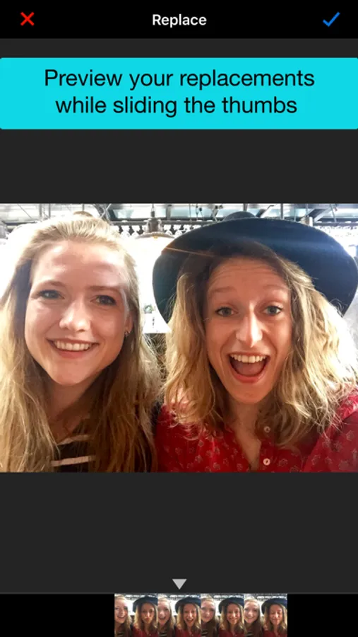 Let everyone look their best in your group shots and selfies. With Clictric, you can replace the faces where someone blinks or yawns by better ones within seconds. Just take a couple of photos with the same people and background. Then tap on the face you want to replace and use the slider to preview your replacement fit in seamlessly!