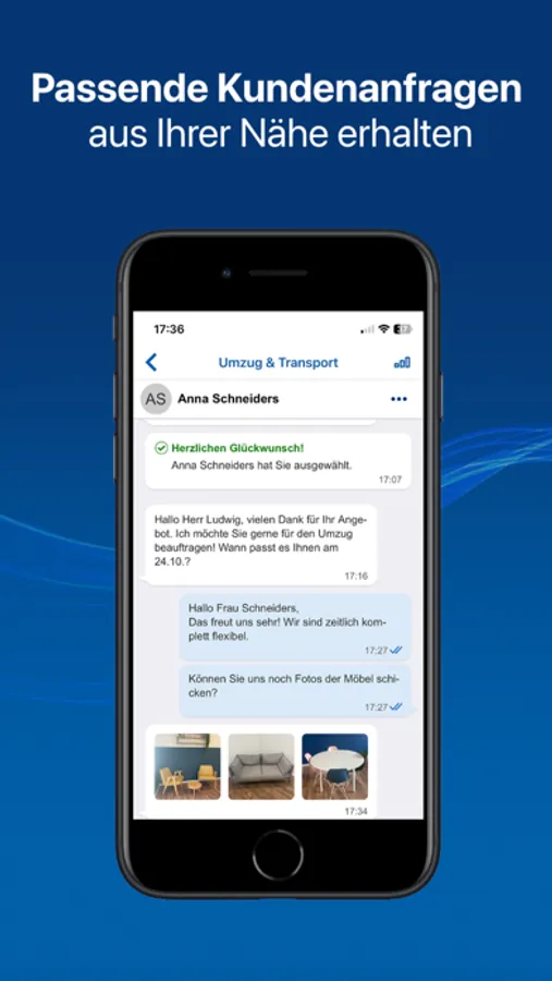 Sie entscheiden, welchen Kunden Sie ein Angebot machen wollen. Klären Sie Details mit Ihren Kunden direkt in unserem Chat.