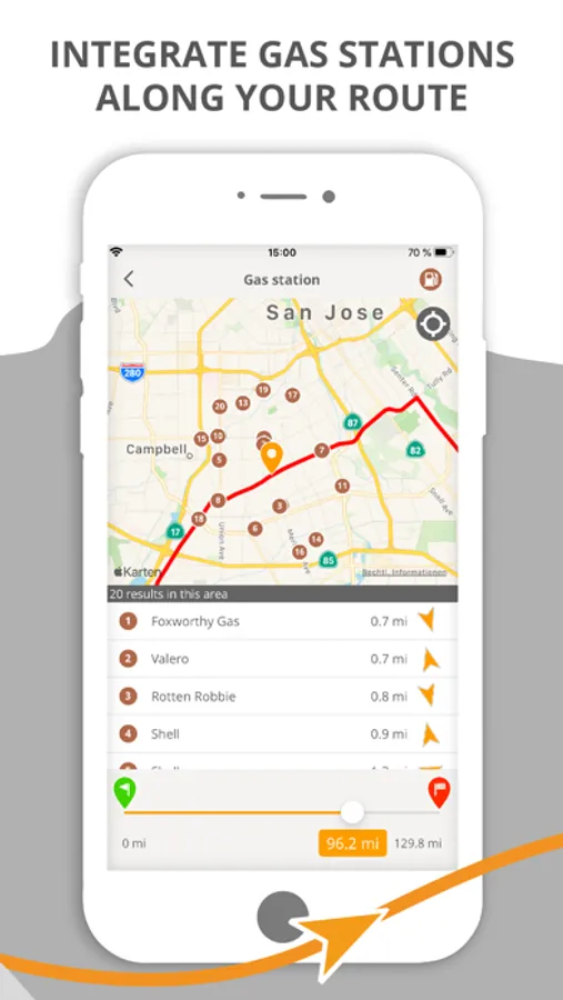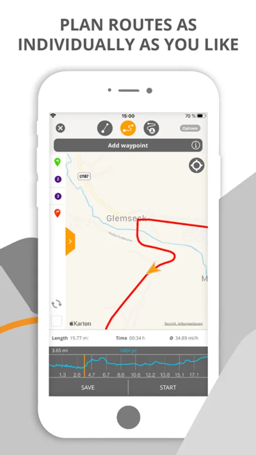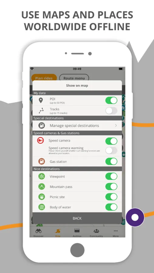 Create curvy routes on winding roads, according to your personal wishes, especially for mopeds, standard routes or generate automatic round routes. Display gas stations and special destinations to viewpoints, cafés, ATMs, etc. along the route and have them automatically added to the route. Edit saved routes, reverse direction with a tap and import tracks as routes.