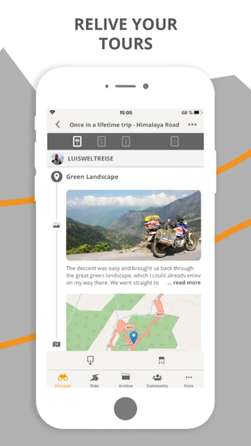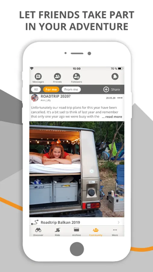 Complete your profile, save your current vehicles, follow other users and make new friends. Share your adventures in the timeline, plan tours with friends in Messenger, or share experiences through other services.