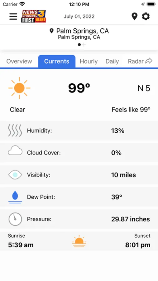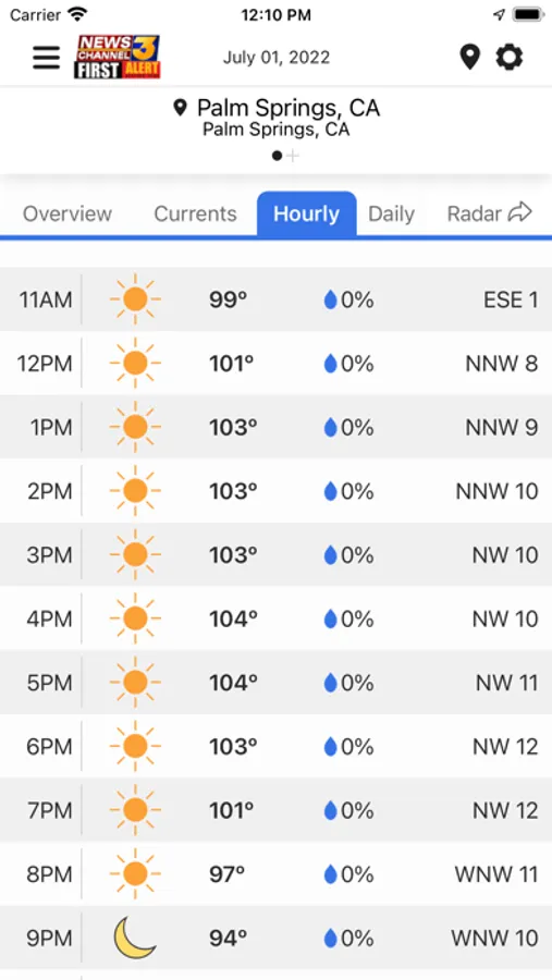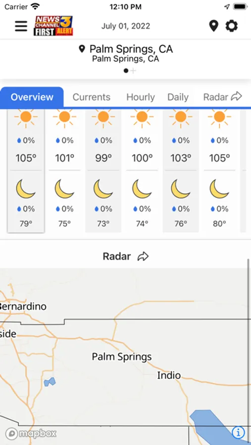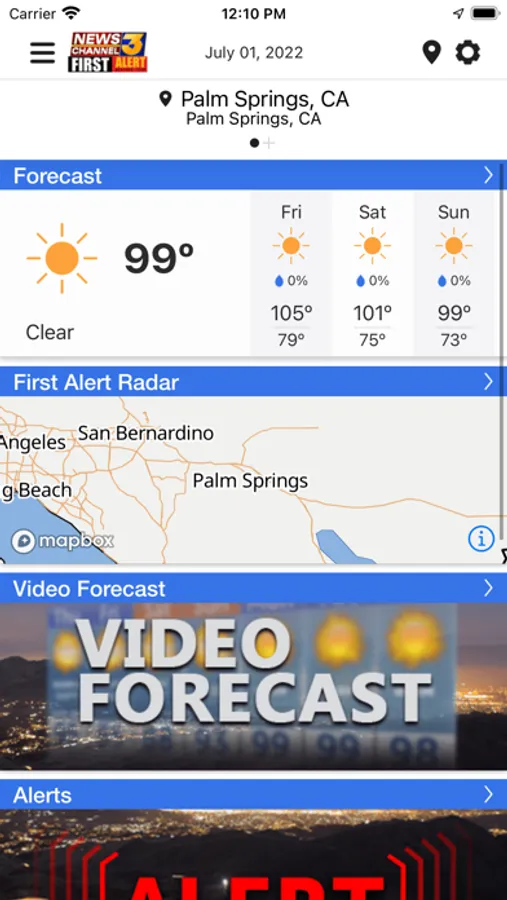 First Alert Weather delivers complete weather information for Palm Springs, Indio and surrounding Coachella Valley communities. The weather teams from KESQ NewsChannel 3 and CBS Local 2 keep you informed on current conditions and provide constant updates with VIPIR Radar, forecasts, severe weather alerts, video and headlines.