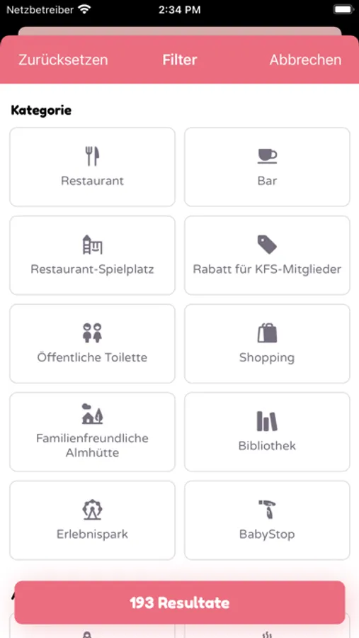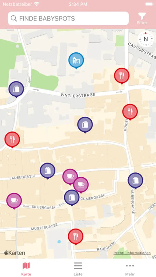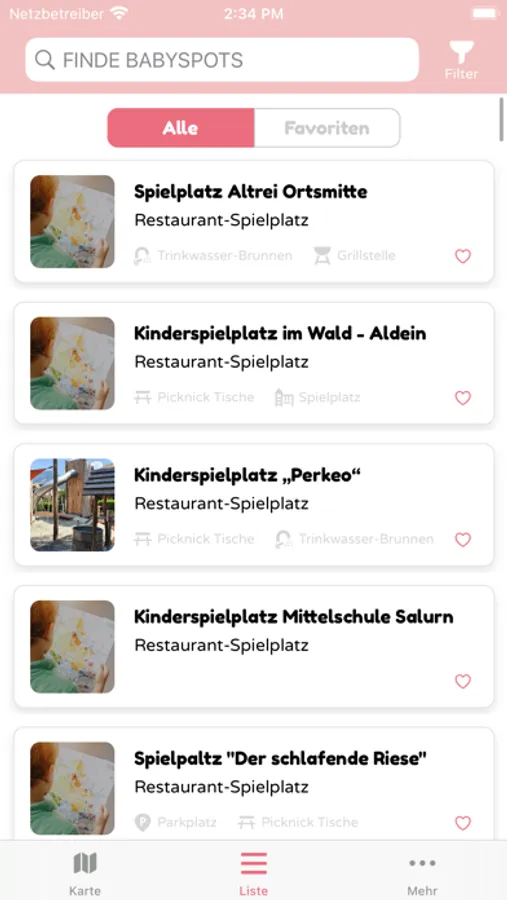 The BabySpot App shows places in different categories. In some categories there are subcategories: For example, you can filter children's playgrounds, only baby-friendly cafés with a changing table or an emergency changing kit, etc.