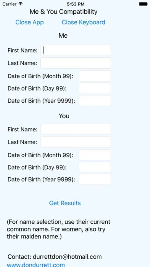 All that is needed are two people's names and dates of birth. It will then use numerology, astrology, and the science of the cards to compute their compatibility. I developed it from my 25 years of metaphysical experience. There is nothing quite like it that I am aware of.