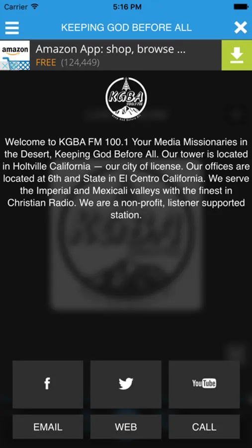 KGBA FM 100.1 Your Media Missionaries in the Imperial Valley encouraging you to Keep God Before All. We serve the Imperial and Mexicali Valleys with the finest in Christian Radio. From Salvation Mountain to Mount Signal we reach Brawley, Calexico, Calipatria, El Centro, Holtville, Imperial, Westmorland, Bombay Beach, Desert Shores, Heber, Niland, Ocotillo, Salton Sea Beach, Salton City, Seeley. We are a non-profit, listener supported station. Download our app and stream KGBA radio on your smartphone!