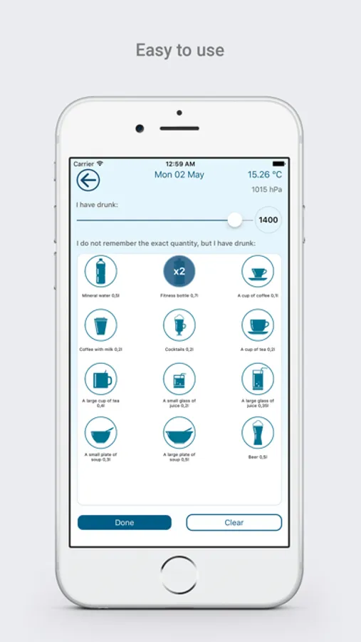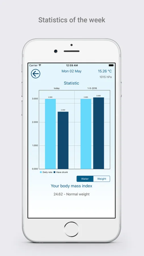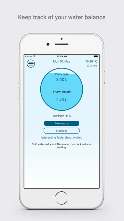 Lack of water, as well as its excessive consumption, may adversely affect your health. This application will help you keep track of exactly how much water you consume each day. By taking into account individual characteristics (weight, height, age, and way of life) along with the climate in the area of the user's residence, this application can calculate the average amount of water your body requires on a daily basis.