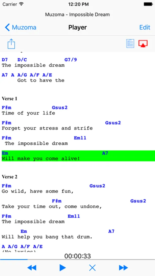 Muzoma allows the playback and recording, organisation and sharing of multi-channel / multi-track and / or stereo / mono backing tracks synchronized with lyric and chord cues on the device and optionally via Apple Airplay (tm) and / or Muzoma's band share peer to peer feature.