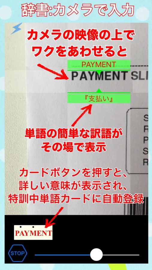 iPhoneのカメラのライブ映像がアプリに表示されます。映像にある枠を知らない単語に合わせると、簡単な訳語が表示されます。同時に、画面の下に調べた言葉が書かれたカードボタンが表示されます。