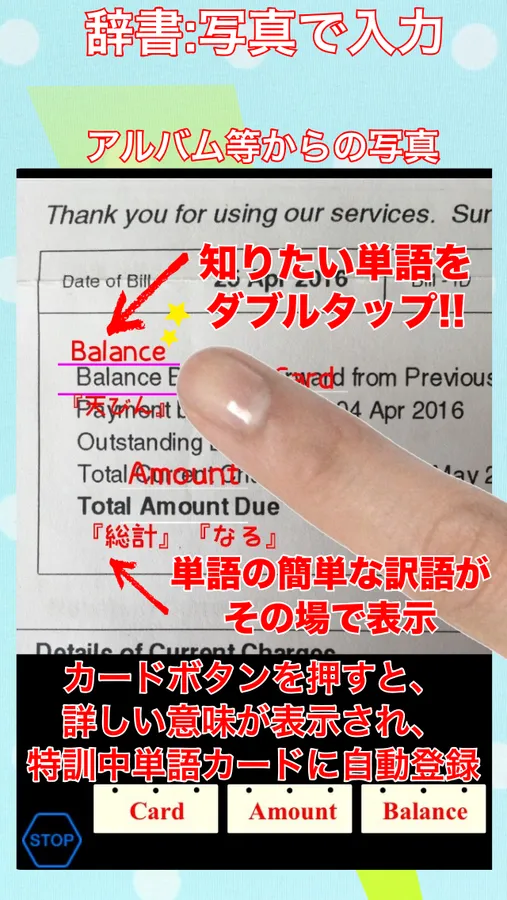 知らない単語がいくつかあったページは、そのまま写真にとってアルバムに保存しておきましょう。「写真で入力」では、保存した写真の上で、知りたい単語の部分をダブルタップすると、その単語の簡単な意味が表示されます。一つの写真で複数の単語を続けて調べることができます。同時に、画面の下に調べた言葉が書かれたカードボタンが表示されます。