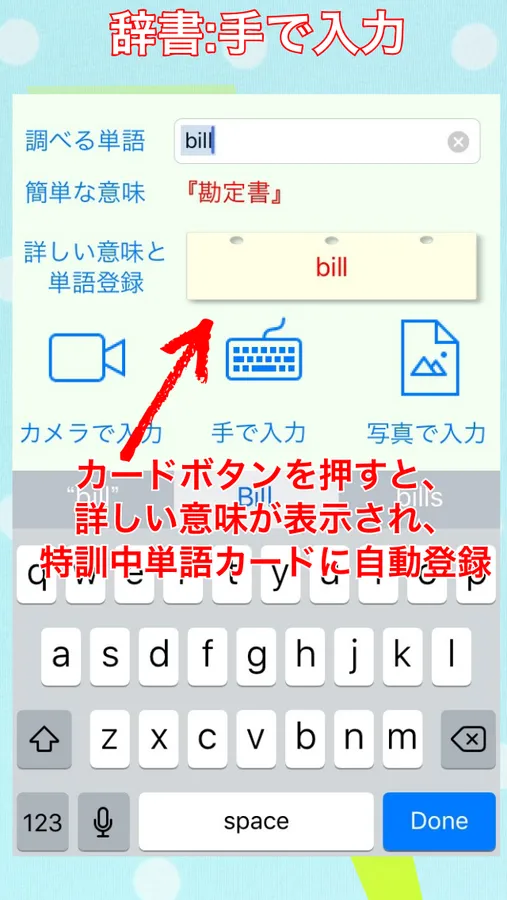 知らない単語があれば、アプリの「カメラで入力」、「手で入力」、「写真で入力」のいずれかお好きな方法で単語を入力してください。