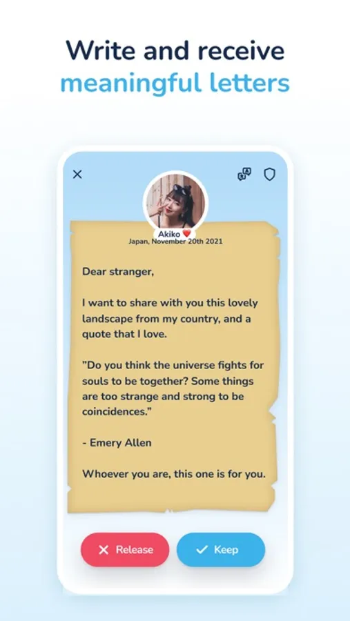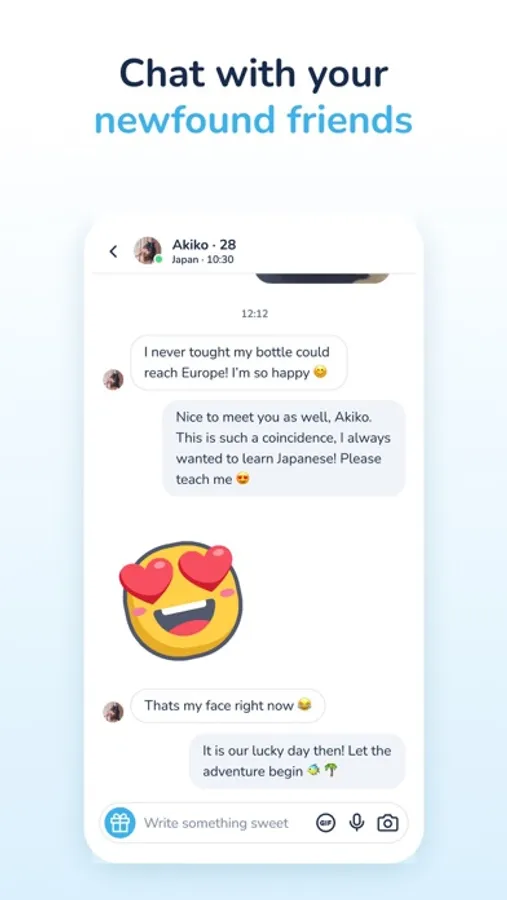 - Chat with people from all around the world whom you have intrigued with your Bottled message