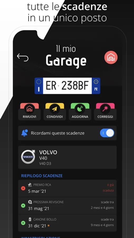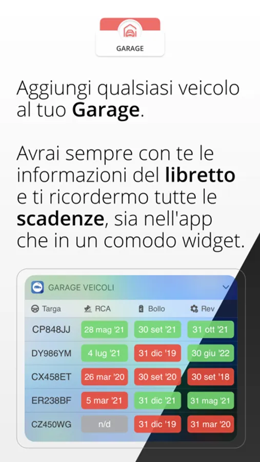 Puoi salvare i tuoi veicoli all'interno del tuo Garage, così da avere tutti i dati sempre a portata di mano ed essere avvisato per ogni scadenza.