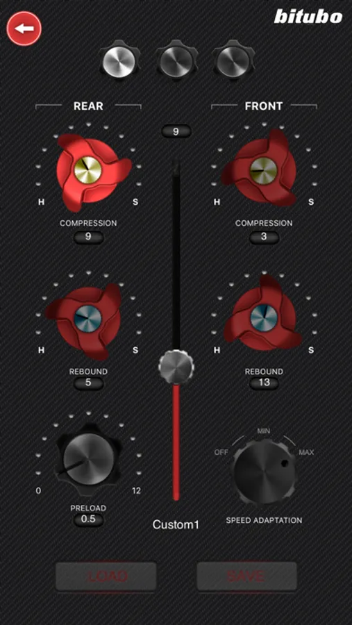 12 settings available: 9 unchangeable factory settings (tuned by Bitubo) and 3 settings fully customizable by the user: compression and rebound for the front and rear suspensions, electronically actuated preload for the rear suspension (only for DS FULL kit), speed adaptation.