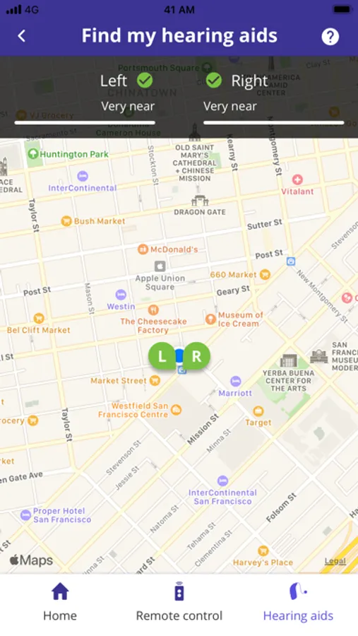The app offers a “Find my hearing aid” search feature, links to user instructions, and low battery notification.