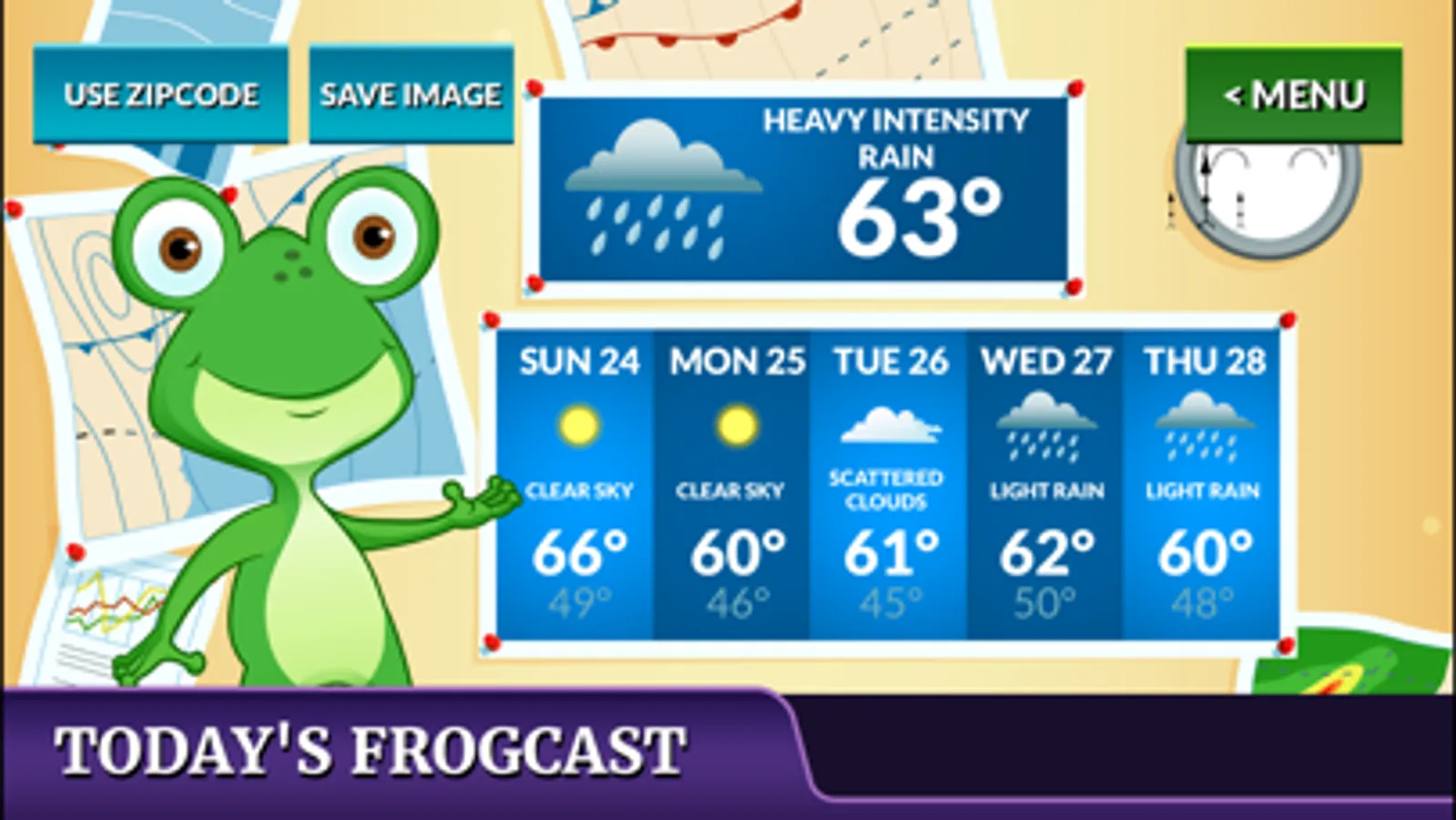 Freddy the Frogcaster’s Weather Station is a fun, educational app for children to view the weather forecast for their area. Freddy will report the current conditions along with the 5 day forecast.