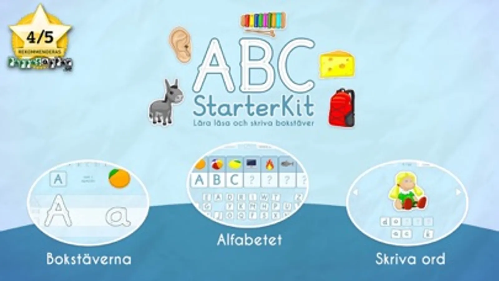 ABC nybörjarkit: Ett interaktivt pedagogiskt spel för att lära sig alfabetet och övningar för att träna skrivning. Fonetiskt utal eller uttal med vokaler, stora eller små bokstäver att spåra.