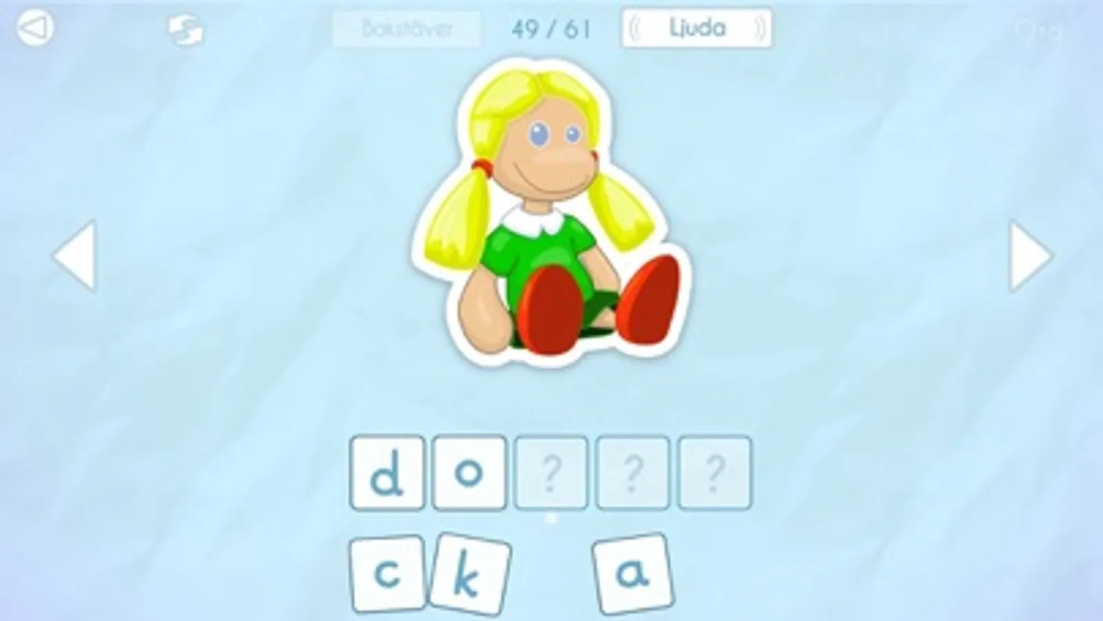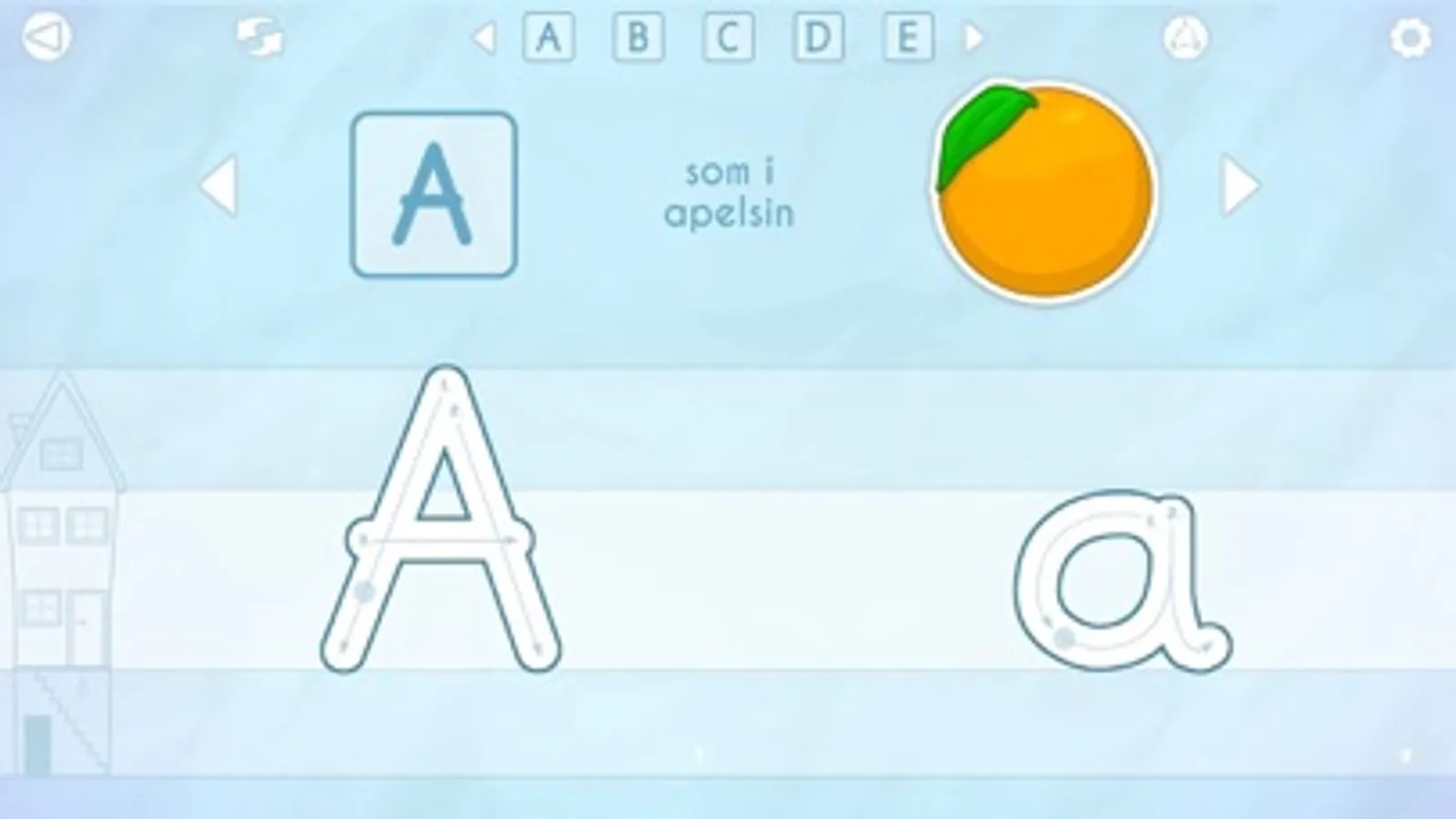 A.) I avdelningen BOKSTÄVER, så presenteras alfabetet från A-Ö med små och stora bokstäver. Bokstäverna ses med en animation som visar hur de skrivs och kan även spåras. Du kan byta mellan ljudning eller bokstavsnamnen. Naturligvis, inkluderas omljud och särskilda former.
