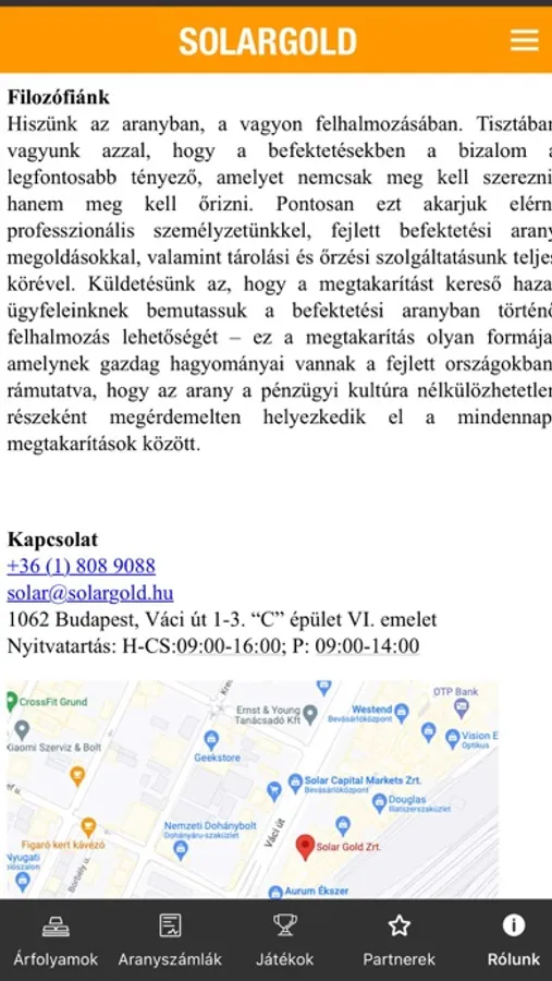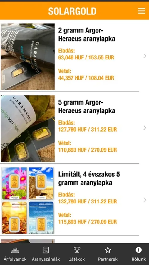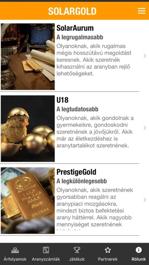 Élő Arany árfolyamok, Aranykapu szolgáltatás elérése az alkalmazáson keresztül a SolarGold alkalmazásban, ami a SGold Trade Zrt tulajdona.